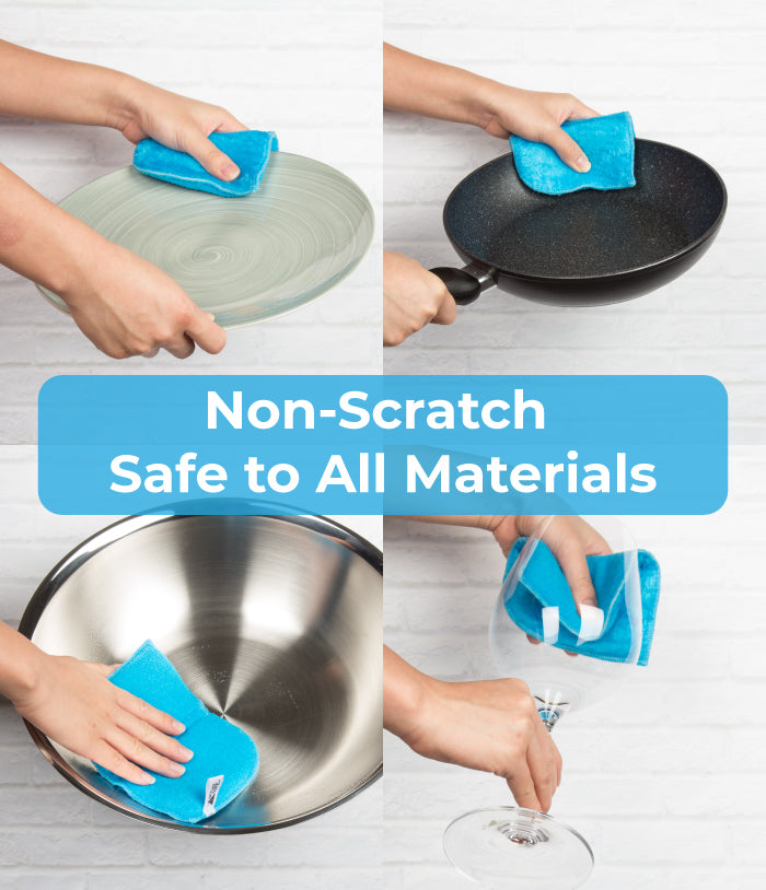 [Non- Abrasive Microfiber side:] - Rub the tough grime more effectively without harming the surface, fits all non-scratch material, i.e. cooker, non stick coating, cast iron skillet, etc
